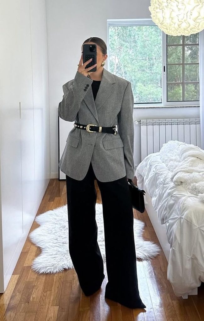 Normaler Blazer + Gürtel drüber (einfach, fertig) – und dazu eine weite Hose. Das wirkt direkt erwachsener. Wenn du’s ganz easy willst: Gürtel nur leicht anziehen, nicht corset-mäßig.